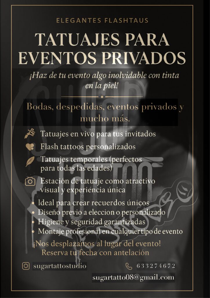 También ofrezco mis servicios en eventos privados, donde llevo la experiencia del tatuaje a un ambiente más íntimo, exclusivo y personalizado. En cada evento me encargo de preparar un espacio seguro y profesional, con todo el material esterilizado y listo para trabajar con la misma calidad que en mi estudio.
